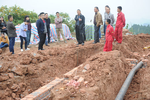 還沒(méi)到達(dá)施工現(xiàn)場(chǎng),崎嶇陡峭的山路就讓大家一路跋涉得氣喘吁吁、汗流浹背,首先體驗(yàn)感受到了野外施工作業(yè)的艱辛。在大石南山山麓高達(dá)數(shù)百米的半山腰上,大家看到了兩處安全隱患施工作業(yè)點(diǎn),挖掘機(jī)在現(xiàn)場(chǎng)正緊張地進(jìn)行施工,所用磚和水泥、砂石等,都已經(jīng)從山下轉(zhuǎn)運(yùn)到位,管道已經(jīng)敷設(shè)完畢。公司茍建華、張愛(ài)明向參加活動(dòng)交流體驗(yàn)人員介紹了工程情況、工作人員的工作和生活條件。