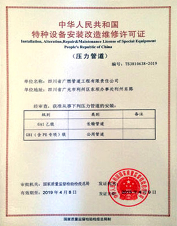四川省廣燃管道工程有限責(zé)任公司已具備壓力管道安裝資格