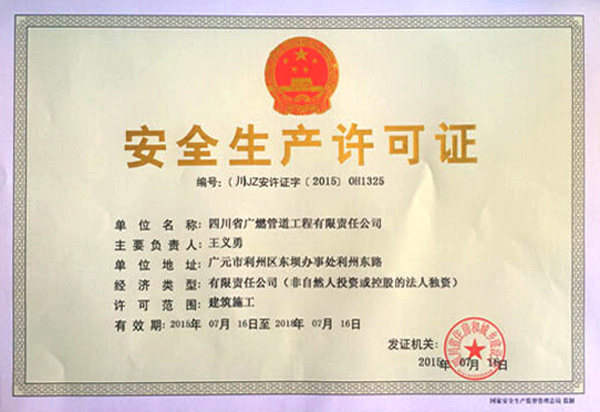 ??? 7月16日,經(jīng)四川省住房和城鄉(xiāng)建設(shè)廳核準(zhǔn),四川省廣燃管道工程有限責(zé)任公司取得建筑施工《安全生產(chǎn)許可證》,自2015年1月和4月該公司分別取得《建筑業(yè)企業(yè)管道工程專業(yè)承包叁級(jí)資質(zhì)》、中華人民共和國(guó)《特種設(shè)備安裝改造維修許可證(壓力管道)GA1乙級(jí)、GB1(含PE專項(xiàng))》資質(zhì)。在該公司成立一周年之際,四川省廣燃管道工程有限責(zé)任公司已具備壓力管道安裝資格,對(duì)于公司拓展市場(chǎng)開展業(yè)務(wù)具有重要戰(zhàn)略意義。